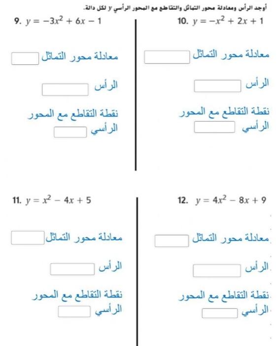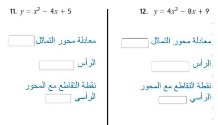 معادلة محور التماثل. .1 معادلة محور التماثل معادلة محور التماثل الرأس الرأس نقطة التقاطع مع المحور الرأسي 12. أوجد الرأس، ومعادلة محور التماثل، والمقطع الصادي لكل تمثيل بياني فيما يأتي مسألة مفتوحة: