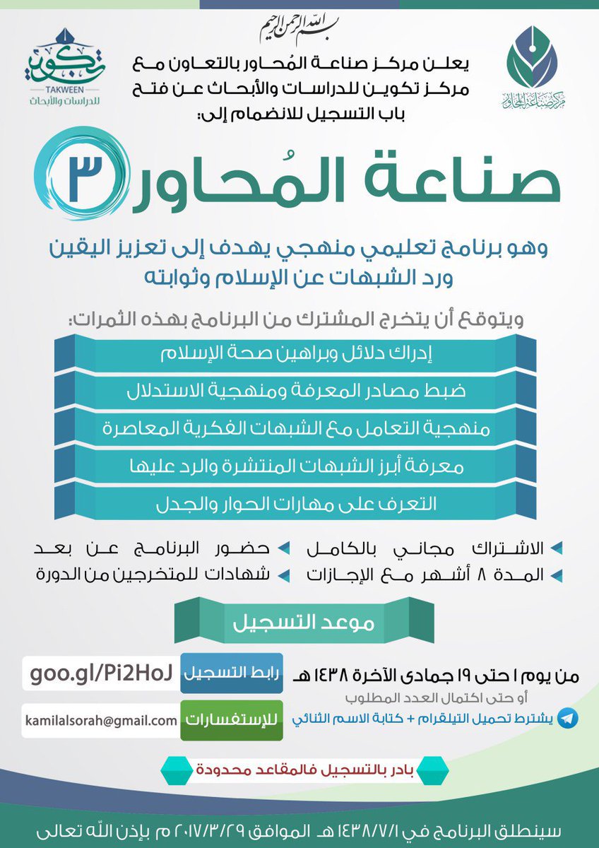 أسئلة اختبار صناعة المحاور. ظهرت بوادر رجوع موجة الإلحاد التي ابتدأت في العالم العربي عام ١٤٣٣/.٢٠١٢ واشتدت في ١٤٣٦/٢٠١٥ وانخفضت في ١٤٣٩/٢٠١٨ (تقريبا) والتوصيات: يجب اجتياز اختبار القبول بنجاح للدخول لهذه المرحلة.