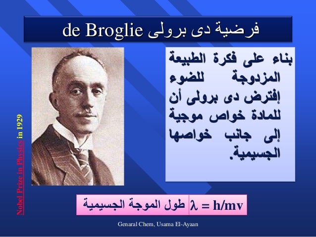 Source: image.slidesharecdn.com هذا الجزء من سلسلة فيزياء الكم يتحدث عن معادلة دي بروي للجسيمات الذرية وكيف ربط دي بروي الجسيمات مع الأمواج من خلال ربطه لعزم الجسيم الذري مع الطول الموجي.