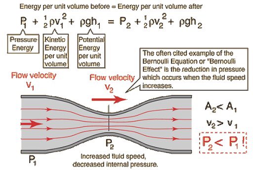 برنولي للسوائل معادلة برنولي. ( مجموع كل من الضغط والطاقة الحركية وطاقة الوضع لوحدة الحجم يساوي مقداراً ثابتاً ). يمكننا تبسيط المعادلة أكثر من خلال أخذ أحد الارتفاعات صفر (نعتمده كنقطةٍ مرجعيةٍ ونأخذ الارتفاع الآخر بشكلٍ نسبيٍّ منه) مثلًا h2 = 0.