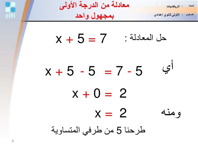 حل معادلة ن+٧ =٥. عند حل أي معادلة جبرية فإن الخطوة الأولى هي تجميع الحدود المتشابهة. س = 8، ويمكن التحقق من صحة الحل بتعويض قيمة س في المعادلة الجذرية.