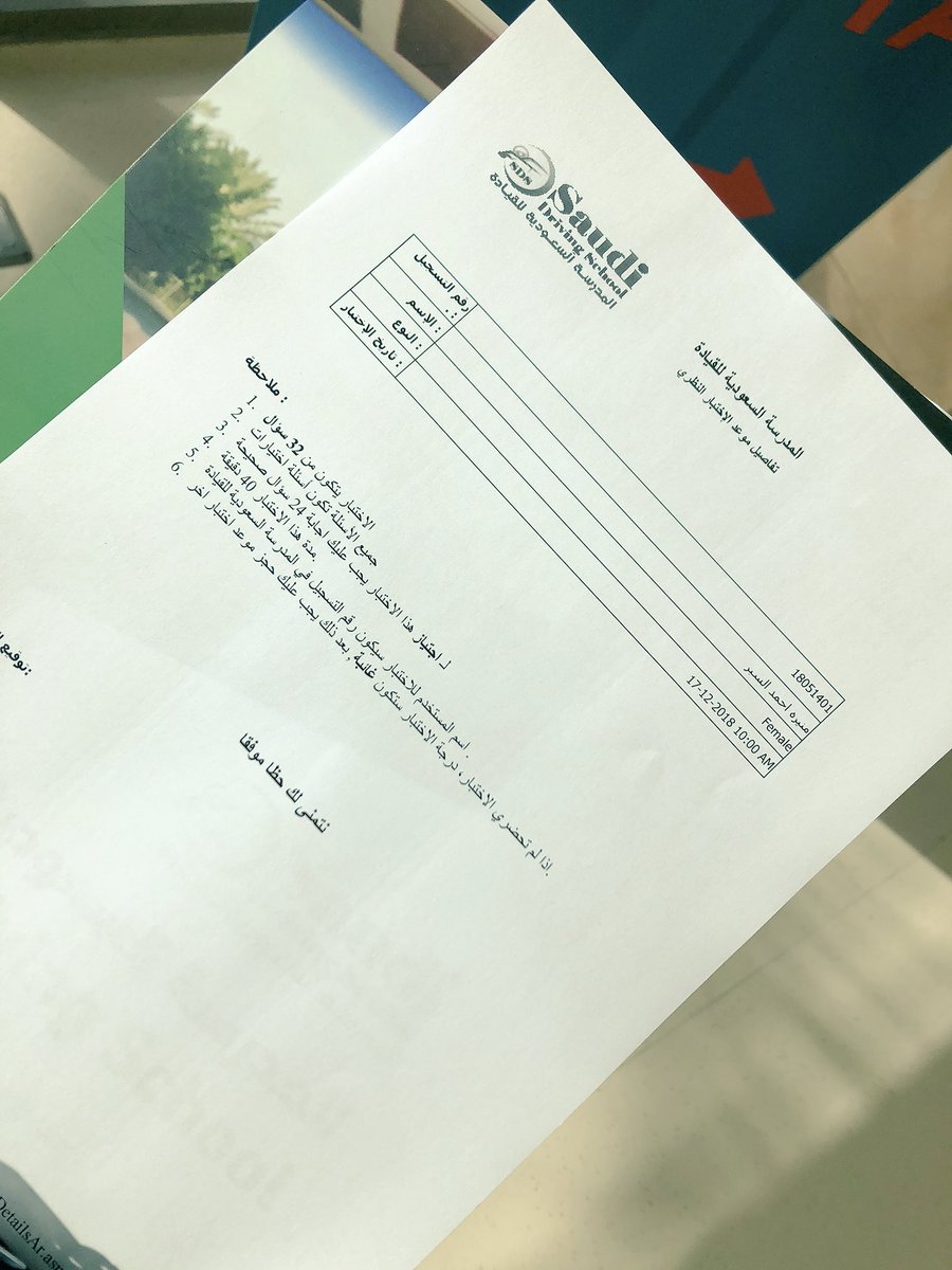أسئلة الاختبار النظري المدرسة السعودية للقيادة. ملف هيئة الطرق والمواصلات الأصلي من المدرسة أو المعهد السابق (إذا تم تسجيله قبل أبريل 2017) 6. المدرسة السعودية للقيادة هي أول مدرسة تتولى تدريب السيدات على القيادة الآمنة في منطقة الرياض، والتي تم تأسيسها بالشراكة مع معهد الإمارات للسياقة بدبي والذي يعد بيت خبرة لتعليم قيادة المركبات في المنطقة.