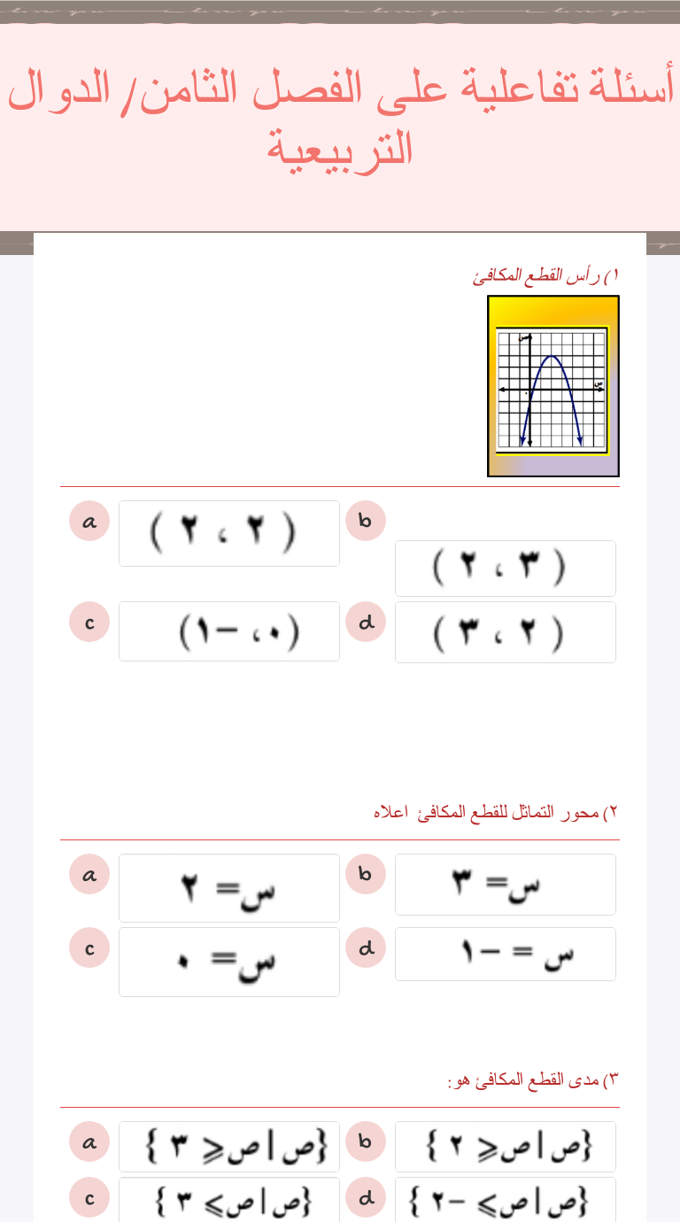 ، ، فيطلق عليها الثوابت أو المعاملات. ما هي أثار العادة السرية على التستوستيرون؟ وأضاف أن ما مررت به من آلام في الخصيتين وحرقان في البول هو نتيجة مباشرة لممارسة العادة السرية، وهذه الأمور هي ما أثرت على نسبة هرمون التستوستيرون لديك، وهو ما أنعكس عليك بالشعور بالبرود. تسمى الغدة النخامية بالغدة الأساسية في الجسم، لكونها المسؤولة عن إفراز العديد من الهرمونات الضرورية، فما هي الغدة. ما محور تماثل منحنى الدالة () = ( + 3)² + 4؟ وصيغة رأس المنحنى هي الدالة في المتغير تساوي ناقص ℎ الكل تربيع زائد ، حيث ℎ و لذا، هنا سيكون محور التماثل عند يساوي سالب ثلاثة لأننا يمكننا أخذ الدالة وطيها عند هذا الخط وسوف نجدها متماثلة.